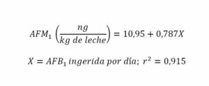 La mayoría de los autores consideran que la tasa de transferencia de las AFs a la leche es entre 1 y 3%, con una transferencia media de 1,7%. Pero esto se ve influenciado por las características de cada animal, la salud, tasa de digestión, entre otros. Incluso se ha verificado una transferencia del 6,7%. Tomando como base la tasa media de transferencia de 1,7%, podemos decir que para alcanzar el límite regulatorio de 0,5 ppb de AFM1 (MERCOSUR, USA y FAO) el animal debe ingerir AFB1 por encima de 30 ppb; así mismo para alcanzar las exigencias europeas de 0,05 ppb, la ingesta debe ser de 3 ppb. (Kuilman, Maas et al. 1998; Moss 2002; Battacone, Nudda et al. 2003; Sassahara, Pontes Netto et al. 2005; Stroud 2006)