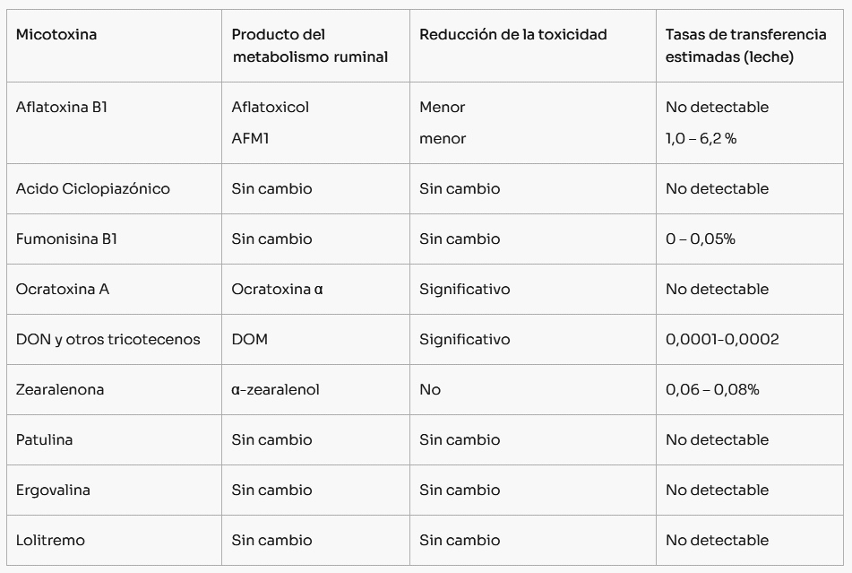 Datos clínicos y experimentales, sugieren que los rumiantes son menos susceptibles que otras especies de animales a los efectos adversos para la salud asociados con la exposición a micotoxinas. Esto se basa en el hecho de que algunas micotoxinas se transforman en metabolitos con menor toxicidad debido a la acción de la flora del rumen, pero esto no ocurre con todas las micotoxinas que contaminan las raciones. (Fink-Gremmels 2008)