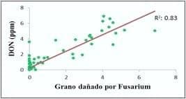 Figura 3. Relación (ajuste lineal) entre el porcentaje de grano dañado por Fusarium y el contenido de deoxinivalenol (DON en ppm) en muestras de trigo analizadas a su arribo al Molino Chacabuco, en 2012/13 y 2013/14.