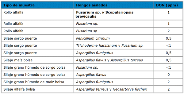 Un intento para el estudio de micotoxinas en forrajes conservados, en particular ensilajes, es la búsqueda de DON o vomitoxina como marcador de presencia de micotoxinas. La misma es producida por especies de Fusarium siendo los cerdos y el ganado lechero las especies más susceptibles. Estudios realizados en Estados Unidos informaron niveles de DON (con variación entre zonas) que oscilaron, en la mayoría de los casos, entre 1 y 3 ppm.