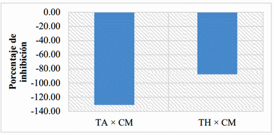 Figura 58. Inhibición de la germinación de Trichoderma asperellum (TA) y T. harzianum (TH) en cultivo dual con Colletotrichum asianum (CM) en medio PDA a 25 °C