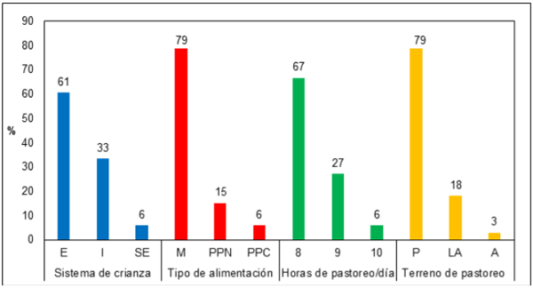 La principal crianza desarrollada comprende al ganado ovino criollo y mestizos, identificando los ovinos de cara blanca y cruces con Hampshire, estos animales también fueron identificados en Tacna, por Salamanca et al. (2018). La crianza de estos ovinos se basa en el sistema extensivo (61%), según Díaz (2013), este sistema de crianza representa el 54% a nivel nacional y se basa en la alimentación a base de pastos naturales de baja calidad, con problemas de sobrepastoreo, limitada transferencia tecnológica y nivel técnico deficiente.