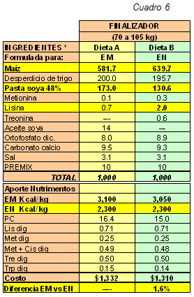 En el cuadro 5 se presenta una lista de ingredientes ordenados por su valor de EM (izquierda). A la derecha se presente el valor de EN y el lugar que ocuparían si en la lista aparecieran ordenados por EN. Nótese que el orden de aparición es diferente al comparar la lista de E. Metabolizable y la lista de E. Neta.