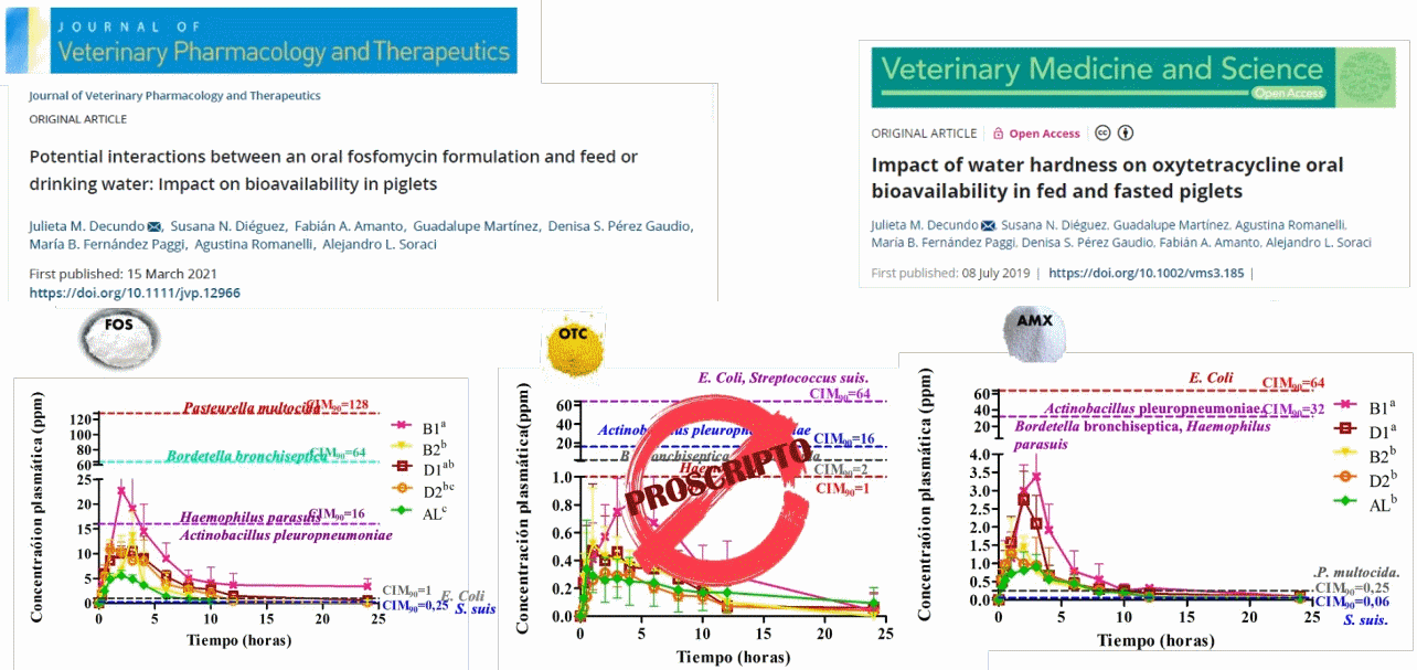 Fig .3. Se representan las interacciones del antibiótico con el alimento y el agua de bebida para tres formulaciones (fosfomicina, oxitetraciclina y amoxicilina) en lechones. Los resultados evidencian una marcada limitación para alcanzar concentraciones plasmáticas superiores a la concentración inhibitoria mínima (CIM) de patógenos relevantes en producción porcina (Decundo et al., 2019, 2021).