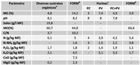 n= número de muestras. FORM: fracción orgánica de residuos municipales, MS: materia seca, MO: materia orgánica, N: nitrógeno total y MF: materia fresca. aSiebertet al., (2008): muestras digeridas (n=167) producidos en plantas alemanas; bEdelmann et al., (2004): n=13, cChadwick (2007) y Smith et al., (2007): cerdo (PC, n=1), vacuno (PV, n=28) y mezcla (n=6), y dPalm (2008): n=7.