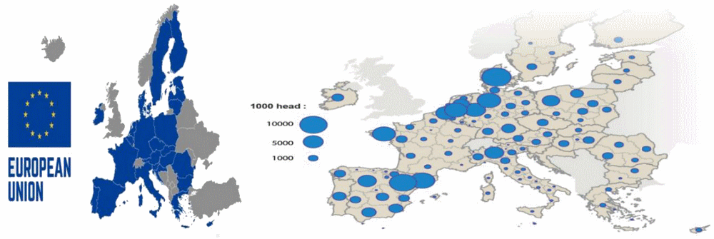 Mapa porcino miles de cabezas de países miembros de la Unión Europea