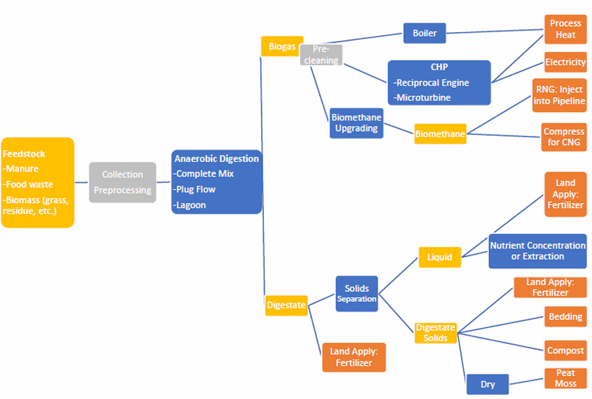 Diagrama básico representativo de la transformación de las excretas para producir energía y materia orgánica. Diagrama esquemático con la entrada de excretas y la salida de productos como gas, líquidos y sólidos.