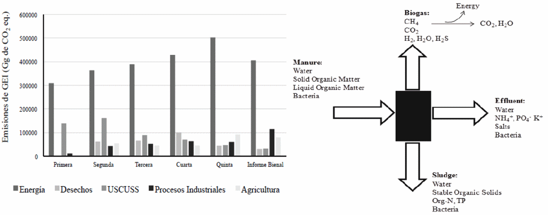 Reportes de México 1era 1997, 2da 2001, 3ra 2006, 4ta 2009, 5ta 2012, Informe bienal 2015. USCUSS uso del suelo, cambio de uso el suelo y silvicultura. las emisiones nacionales de México en agricultura es el 6.4% del total, el sector energía es el mayor causante de GEI y CO₂ equivalente. Para las actividades porcinas hay un modelo dirigido de tres niveles que mediante el aprovechamiento circulante integra ingresos adicionales a la granja.