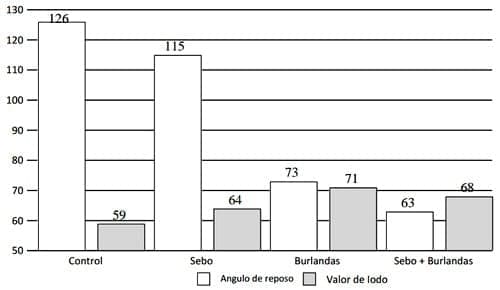 Figura 1. Efectos de la alimentación de cerdos de engorda con dietas suplementadas con sebo (5%) o burlandas de maíz (30%) en el ángulo de reposo (°) y valor de iodo del tocino (Pomerenke, 2011)