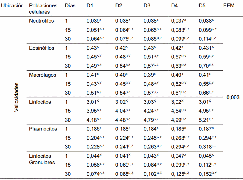 Click aquí para ampliar la imagen D1: Alimento comercial sin antibiótico y sin probiótico; D2: Alimento comercial + antibiótico; D3: Alimento comercial sin antibiótico + L. acidophilus; D4: Alimento comercial sin antibiótico + L. casei; D5: Alimento comercial sin antibiótico + E. faecium. A,B,C,D,E Dentro de una misma fila, medias con diferente superíndice son estadísticamente diferentes (p< 0,05). X,Y,Z Dentro de una misma columna, medias con un superíndice común (por variable en estudio) no difieren estadísticamente (p< 0,05). EEM: Error estándar de la media.