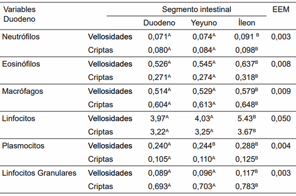 Para los segmentos intestinales se ha observado diferencia estadística significativa (p< 0,01) para las poblaciones celulares intestinales, donde duodeno exhibió los valores más bajos en comparación con los otros dos segmentos (yeyuno e íleon) tanto en vellosidades como en criptas intestinales (tabla IV).