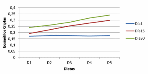 En relación al parámetro de las poblaciones celulares inmunes estudiadas en las criptas intestinales entre cada una de las dietas y periodos de exposición, los cambios se pueden observar en la tabla III. Las poblaciones celulares presentaron un aumento estadístico significativo (p< 0,01) entre las diferentes dietas evaluadas dentro de cada período de evaluación, donde D1 obtuvo valores menores respecto a D2 y frente a las dietas con probióticos, donde los animales en D5 mostraron los valores más altos en las poblaciones de células intestinales. Para las mismas variables en estudio se presentó diferencia significativa estadística entre los diferentes días de muestreo dentro de cada una de las dietas (p< 0,05), donde en el día 30 se presentaron los mayores valores para cada dieta en estudio.