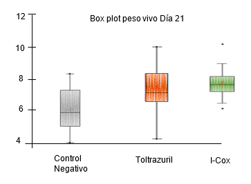 No se observaron diferencias significativas (P> 0,05) en el peso vivo entre los diferentes grupos al cabo de los 7 primeros días de vida. Sin embargo, para los días 14 y 21, los lechones del grupo I-Cox presentaron mayor peso vivo seguido por el grupo control positivo que recibió toltrazuril comparados con el grupo control negativo (P< 0,05) (Figura 1).