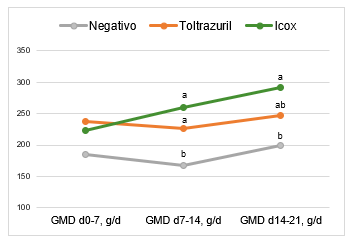 En la Figura 2, no se observan diferencias significativas (P> 0,05) en la ganancia media diaria (GMD) entre los grupos a los 7 primeros días de vida. No obstante, al cabo de 14 y 21 días, los lechones del grupo suplementado con la combinación de fitogénicos presentaron mejor ganancia media diaria seguido por el grupo control positivo (con toltrazuril) comparados con el grupo control negativo (P< 0,05). Se observó un cambio notorio de 7 a 14 días donde el grupo control positivo presentó una ligera caída de la ganancia de peso.