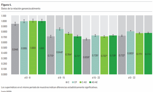 Los resultados de este experimento mostraron que es posible reducir o reemplazar los antibióticos en el alimento por alternativas naturales y mejorar los parámetros de desempeño en lechones destetados. El desempeño productivo de los cerdos alimentados con carbadox seguido de Biotronic® Top3 (C-AO) no difirió en comparación con el de los cerdos alimentados con carbadox seguido de neomicina y oxitetraciclina (CP). Además, la combinación de Biotronic® Top3 (una mezcla de ácido fórmico, propiónico y acético combinada con cinamaldehído y la mezcla Permeabilizing Complex™) y Digestarom® P.E.P. (una mezcla fitógena de orégano, anís, aceite de cítricos y fructooligosacáridos con propiedades antioxidantes y antiinflamatorias) significó una alternativa natural viable frente a los antibióticos en el alimento.