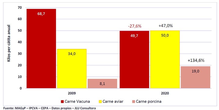 Hoy ya la carne vacuna tiene dos carnes complementarias, la aviar y la porcina y entres las tres superan los 115 kg. per cápita. Todo indica que la carne vacuna continuará con el descenso en el consumo, tanto del lado de la oferta local, como de los precios que condicionan su consumo. La carne aviar ha llegado a un record altísimo y será complicado una suba importante por encima de los valores ya alcanzados.