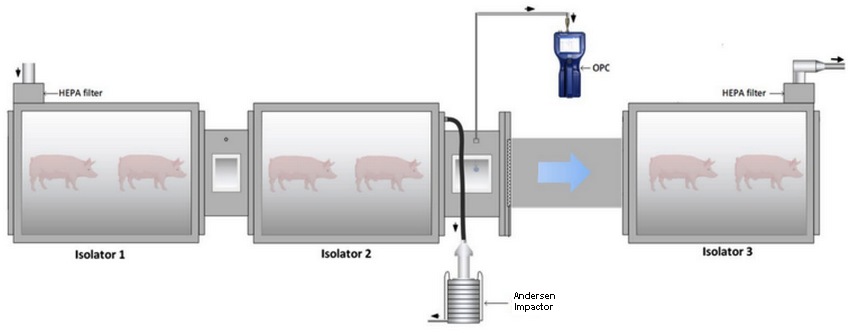 El experimento involucra un sistema de aisladores modulares conectados con flujo de aire unidireccional entre animales infectados y naïve. Los investigadores inocularon 24 lechones de 18 a 21 días con una cepa H1N1 de origen porcino, y analizaron las emisiones aéreas de partículas en un rango que iba de < 0,22 µm hasta > 8 µm durante 6 días posinoculación (DPI).