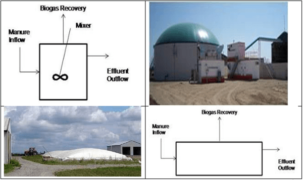 Sistema bajo con mezclador. Sistema de bajo rango con 18 días de retención produce 0.22 m3 de metano por kilogramo de sólidos volátiles. Sistema bajo con tapón. Diagrama de sistema bajo con tapón. Sistema de entrada, almacenaje, captura de gas y salida.