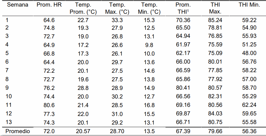 Determinación del THI. Los datos de temperatura (t °C) y humedad relativa (HR, %) se tomaron con un termo higrómetro, ubicado dentro de la unidad experimental, y se registraron diariamente durante el periodo experimental (cuadros 3 y 4). El índice de temperatura y humedad (THI), se calculó utilizando la fórmula THI = [0.8 x temperatura ambiente] + [(% HR/100) x (temperatura ambiente – 14.4)] + 46.4 (Mader et al., 2006).