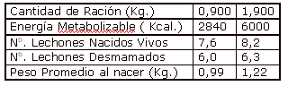 Tabla 7: Efecto del aumento de la cantidad de ración en la fase final de gestación.
