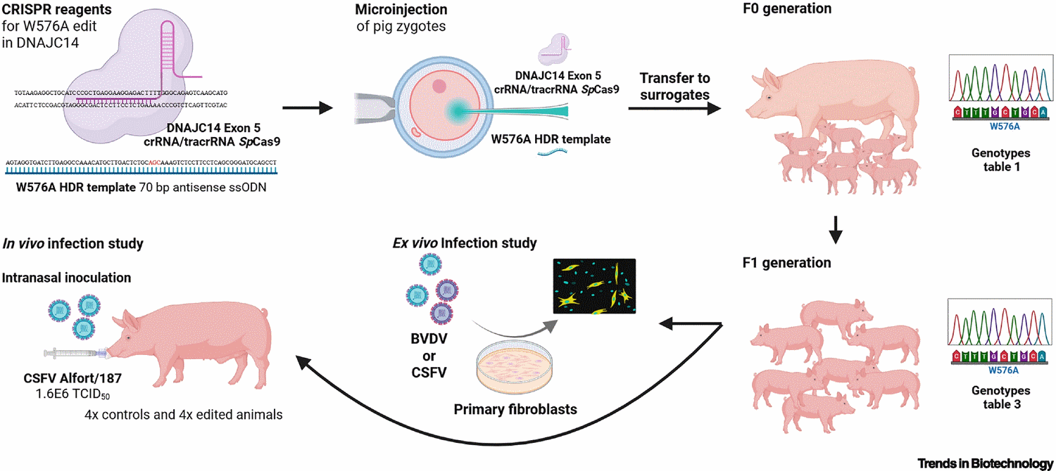 Helen Crooke, Stefanie Schwindt, Sarah L. Fletcher, Olaf Isken, Sophie Harding, Nicholas Berkley, Christine Tait-Burkard, Claire Warren, C. Bruce A. Whitelaw, Norbert Tautz, Simon G. Lillico, DNAJC14 gene-edited pigs are resistant to classical pestiviruses, Trends in Biotechnology, 2025, ISSN 0167-7799, https://doi.org/10.1016/j.tibtech.2025.09.008