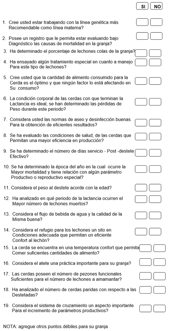 En el siguiente cuestionario contestado con objetividad usted podría descubrir los puntos débiles de la mortalidad al nacimiento en su explotación que fortaleciéndolos podría usted pertenecer al grupo de granjas con altos rendimientos y buenas utilidades.