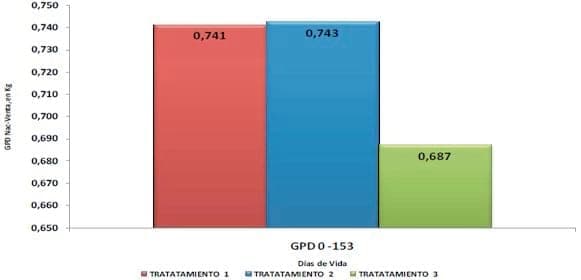 En el periodo de 70 a 153 días de vida los animales que recibieron el programa de alimentación “TRATAMIENTO 1” en el sector de recría tuvieron una ganancia de peso superior de 8,25 kg por animal comparados al tratamiento 3. En términos porcentuales los animales que habían recibido el programa de alimentación “TRATAMIENTO 1” en el sitio de recría proporcionó un aumento del 7,85 % para el peso vivo final, 8,5 % para GPD cuando comparados al tratamientos 3.