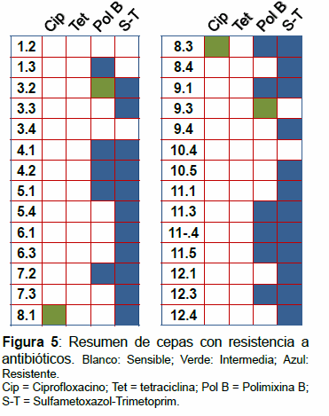 Prueba de Sensibilidad a Antibióticos: Se evaluó la sensibilidad de las cepas a ciprofloxacino, tetraciclina, polimixina B y sulfametoxazol-trimetoprim mediante ensayo de CIM en agar.