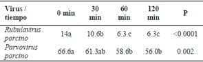 Titulación viral. Los virus utilizados fueron titulados mediante la realización de diluciones dobles seriadas, resultando los siguientes títulos: Rubulavirus porcino 1:64 y para Parvovirus porcino 1:256.